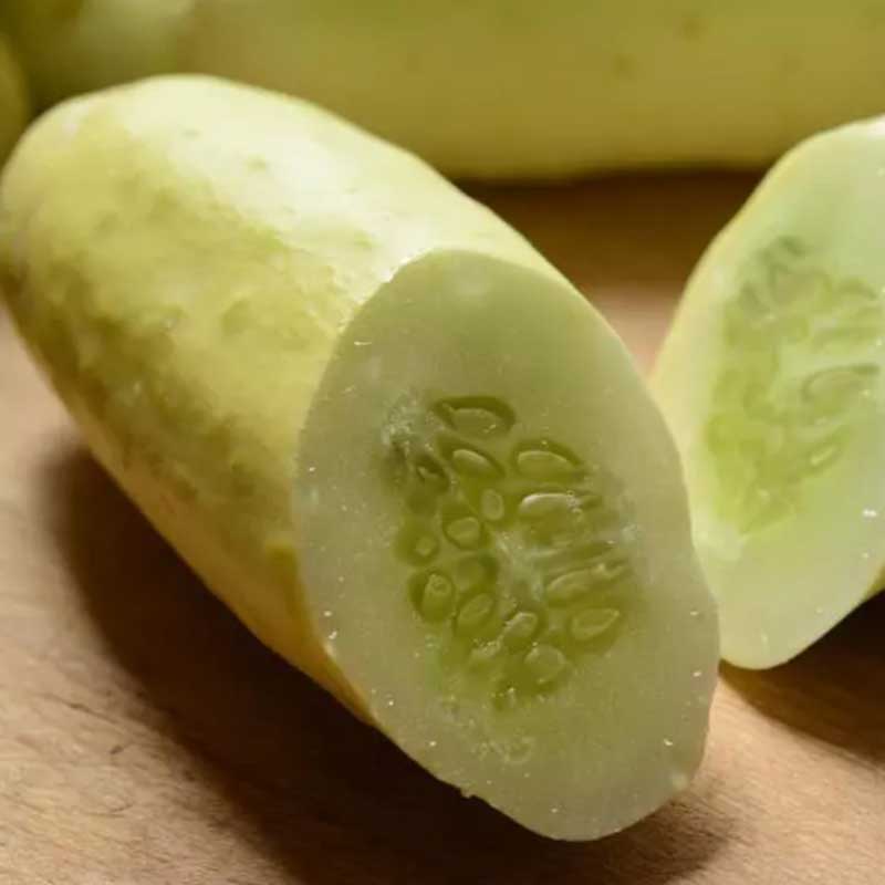 Petit concombre qui se distingue par sa couleur extérieure blanche et sa maturité hâtive. Pelure mince, fruit doux, croquant et sans amertume qui n’a pas besoin d’être pelé. Plant tolérant à l’oïdium.